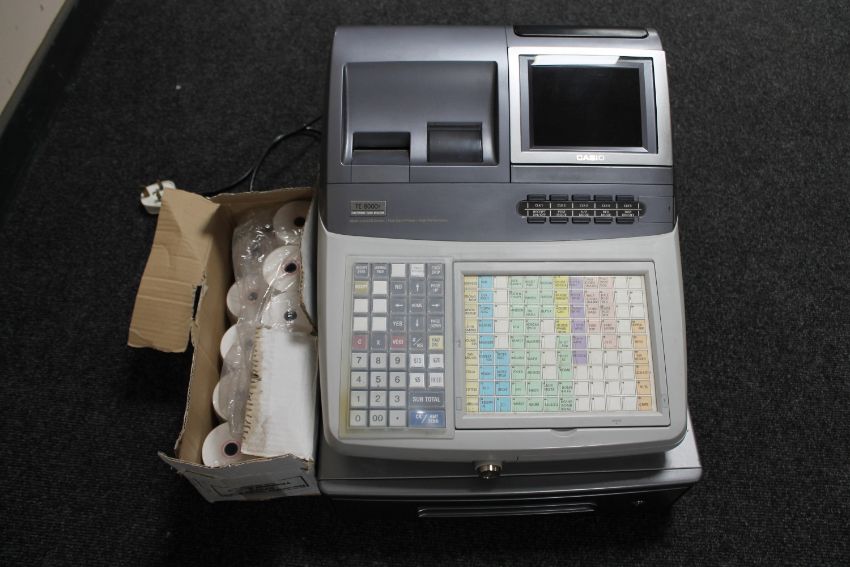 A Casio T-800F electronic cash register (no keys) and a box of till rolls