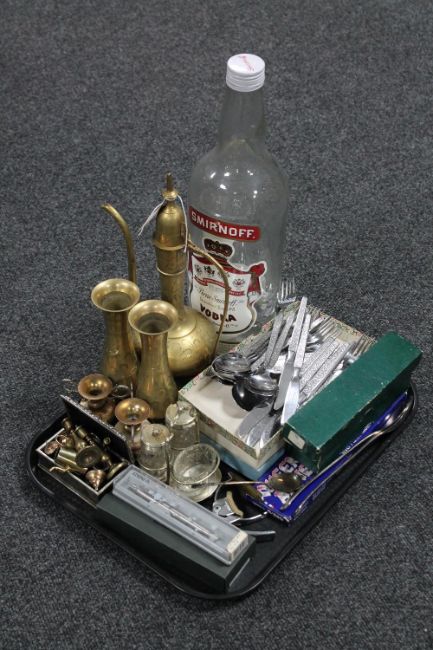 A tray of assorted cutlery, brass ware, Parker and Cross pens, Smirnoff vodka bottle