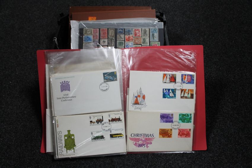 A basket of stamp albums, first day covers