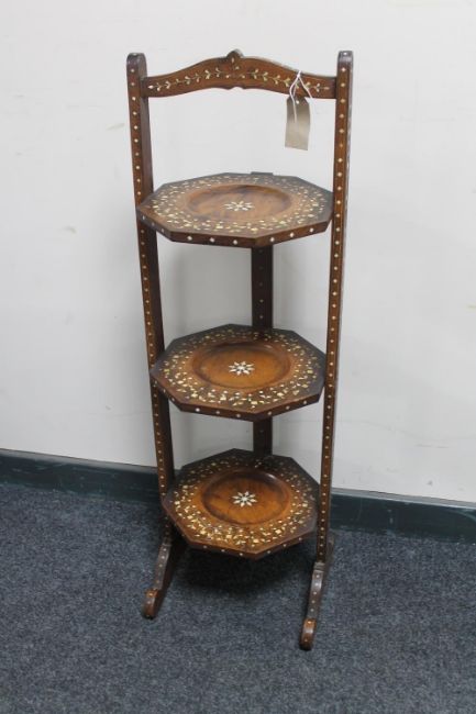 An Eastern inlaid three tier folding cake stand