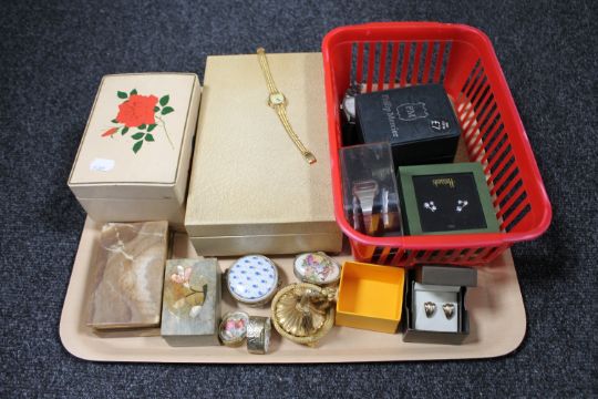 A tray of jewellery boxes, costume jewellery, pair of 9ct gold earrings