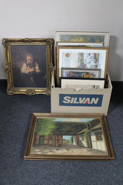 A box containing continental pictures and prints including framed needlework panels, oils including rural scenes, Parisian street scene etc
