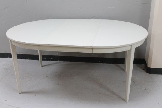 A circular white kitchen table with extension leaf