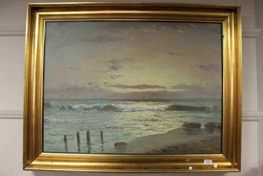 Continental school : sun set at low tide, oil on canvas, 85 cm x 62 cm, indistinctly signed.