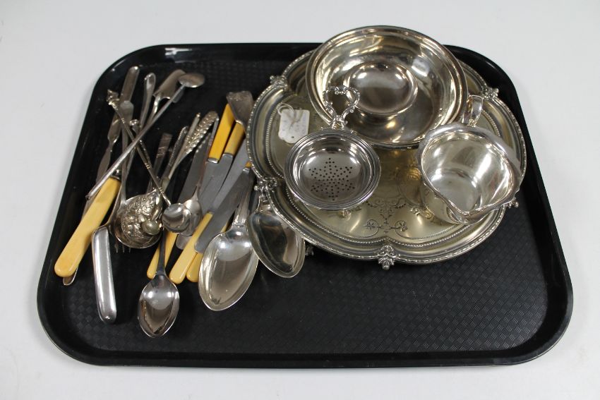 A tray of silver plated tray, butter knives, strainer, pair of Elkington table spoons, cheese and marrow scoops etc