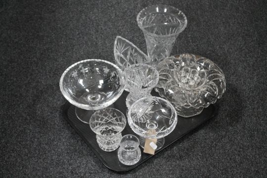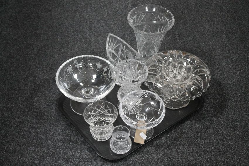 A tray of assorted glass ware - lead crystal and cut glass vases, comports, flower holder, etc