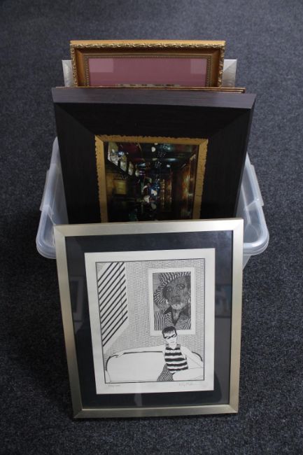 A box of eight assorted framed pictures and prints : Ray Mullen print, religious etc