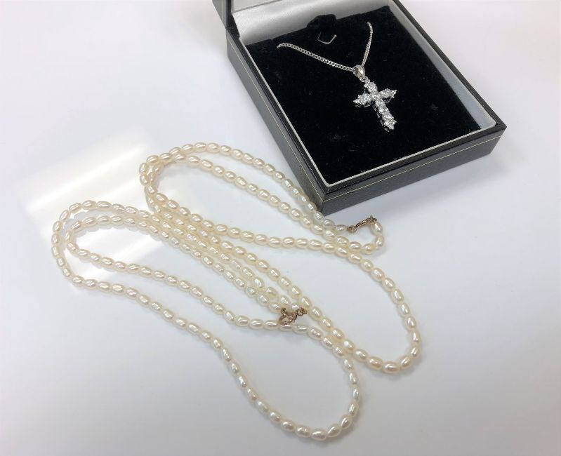 Two cultured pearl necklaces with 9ct gold clasps, together with a costume necklace
