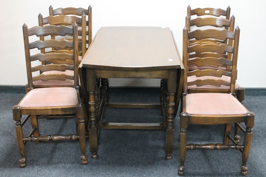 A Reprodux oak gate leg table and six ladder back dining chairs.