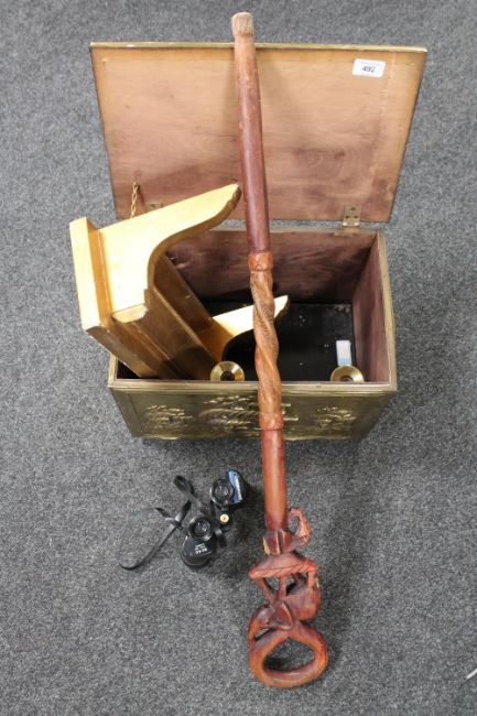 A brass embossed box containing a gilt wall shelf, tribal walking stick, brass candlesticks and a pair of Commodore binoculars