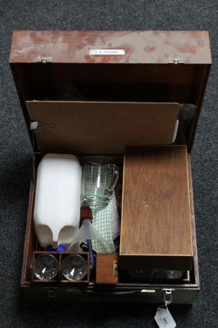 A teak box containing wine glasses and wine making equipment