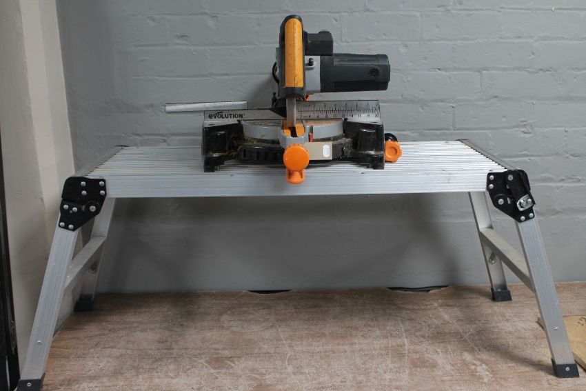 An Evolution sliding compound mitre saw on a folding aluminium stand