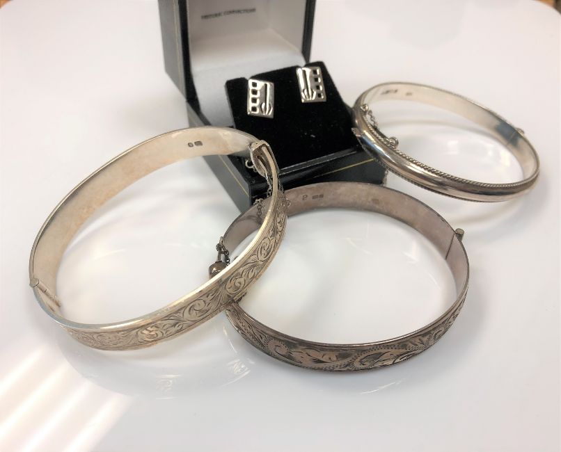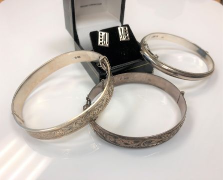 Three silver bangles and a pair of Charles Rennie Mackintosh inspired silver earrings