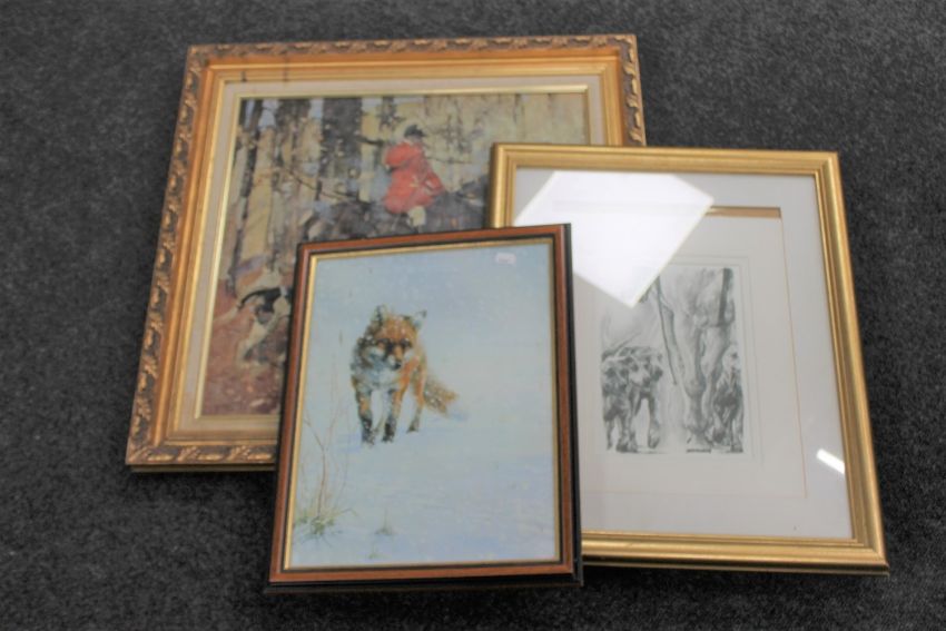 A gilt framed print, huntsman with hounds, together with a similar picture of a huntsman and a picture of a fox
