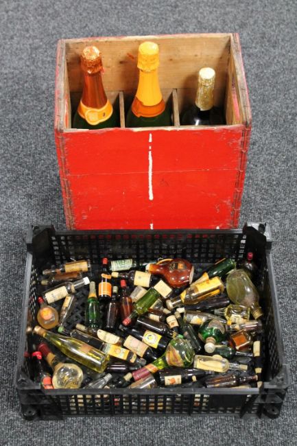 A basket of a quantity of alcohol miniatures together with a further crate containing a 50th Anniversary Battle of Britain ale and two bottles of Buck's fizz