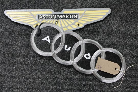 Two cast iron Aston Martin and Audi signs
