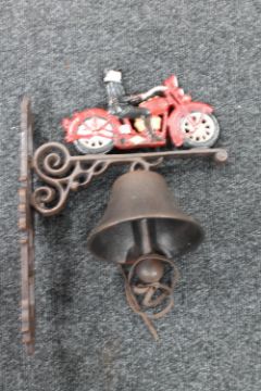 A cast iron vintage motorcycle wall bracket with bell