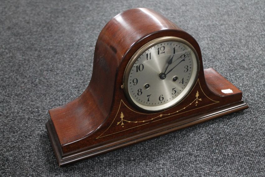 An early 20th century inlaid mahogany mantel clock with silvered dial