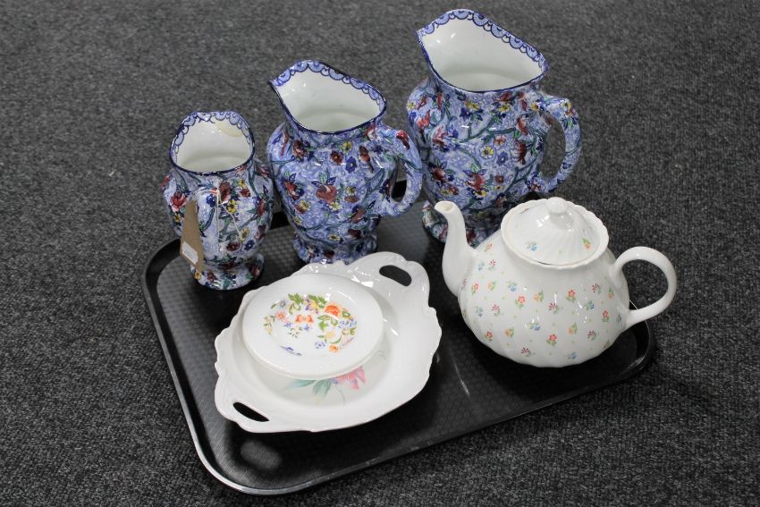 A tray of three graduated Ringtons water jugs, Wedgwood Cascade china teapot and three Aynsley dishes