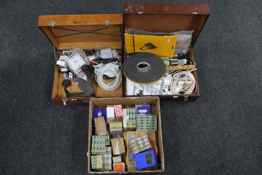 Two wooden storage boxes together with a cardboard box containing cobbler's last, hardware, paint brushes, sanding paper etc