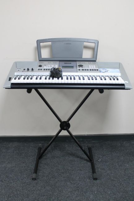 A Yamaha PRS E413 electric keyboard on stand with lead
