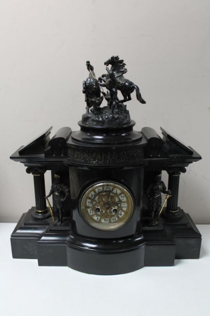 An impressive Victorian slate mantel timepiece with pendulum and key