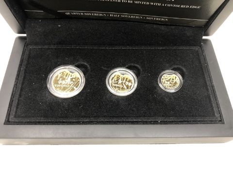 The Heroes of D-Day 75th Anniversary Gold Sovereign Prestige Set, the world's first Sovereign coins ever to be minted with a contoured edge, comprising $10 full sovereign, $5 sovereign and $2.50 quarter sovereign, marked Sword, Juno and Gold respectively, in fitted case with certificate of authenticity, by Hattons of London, together with two books; The Twelve Greatest Sovereigns and D-Day by Stewart Binns.