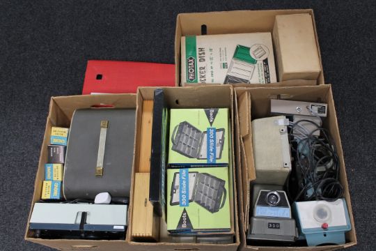 Four boxes containing vintage projectors, slide supporters, files and magazines
