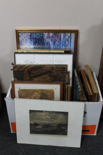 A box of a quantity of continental school pictures and prints, tiled panel, oils etc