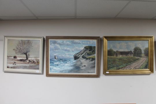 Three 20th century continental school oils on canvas; winter landscape, coastal scene and cottage in rural setting