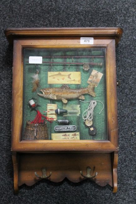 A wall mounted key cabinet containing a fishing montage