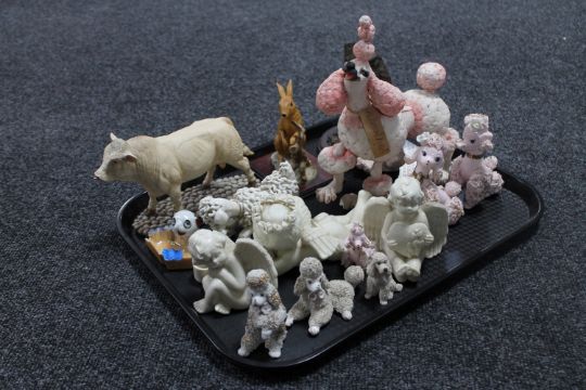 A tray containing cherub figures, a Sheratt and Simpson Bull, animal figures etc