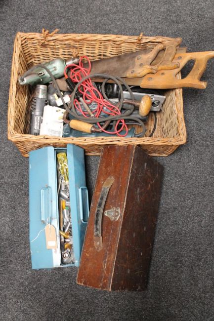 A pine box together with a wicker basket containing hand saws and power tools, a concertina tool box of hand tools