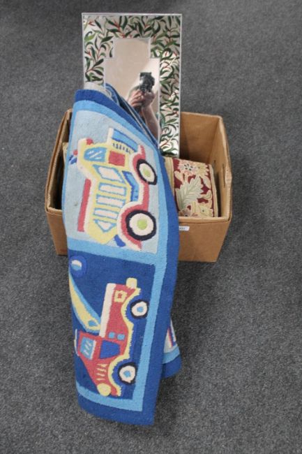 A box of a chain stitch rug together with two further rugs and two hand painted leaded glass mirrors