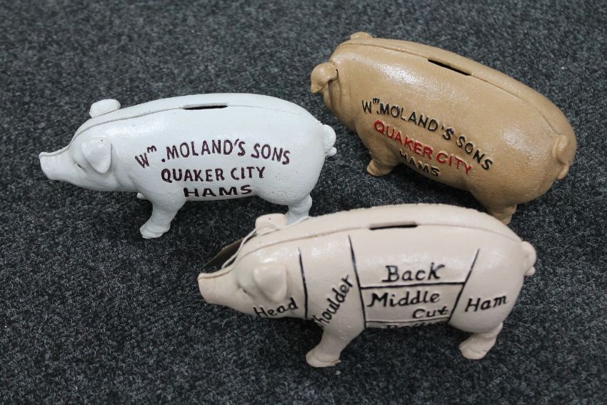 Three cast iron pig money boxes