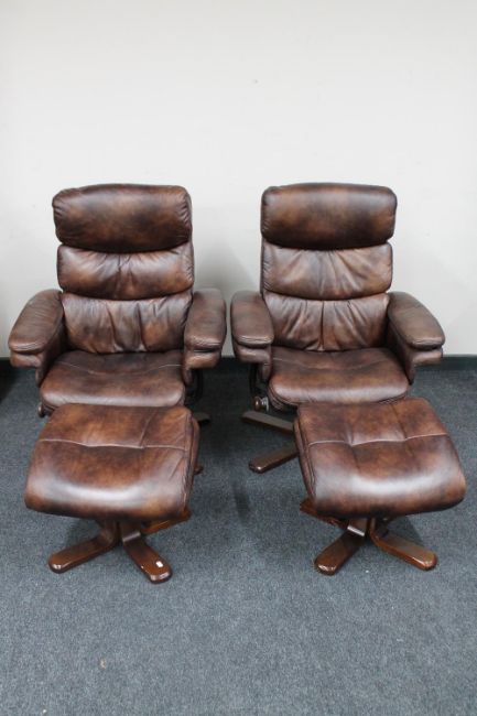 A pair of contemporary swivel adjustable relaxer chairs with stools