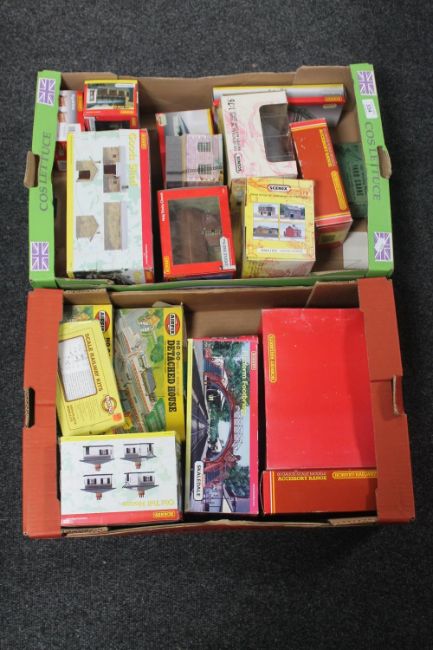 Two boxes of model railway buildings, Hornby goods shed, platform items etc