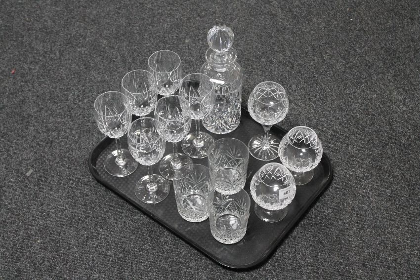 A tray of crystal glasses and decanter