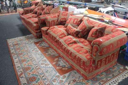 A Furniture Village oversized four piece lounge suite : four seater settee, three seater settee, chair and large footstool in Byzantine design.