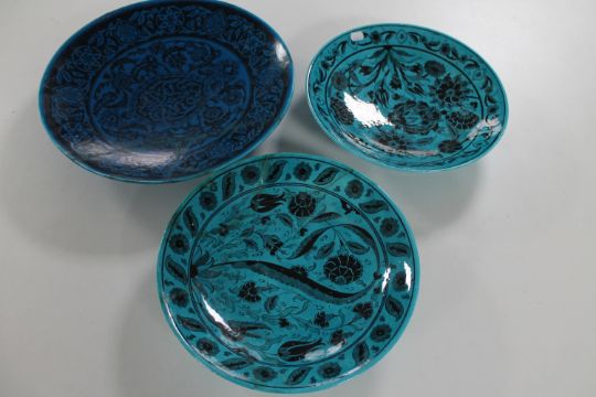 A pair of glazed pottery Turkish plates in a 16th century design and one other similar plate