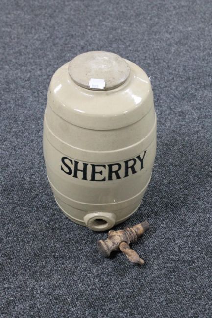 An earthenware sherry barrel with tap