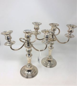 A pair of silver plated three branch candelabra, height 29cm
