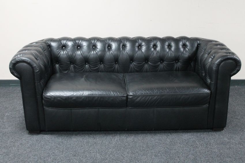 A black leather Chesterfield two seater settee