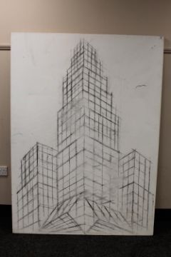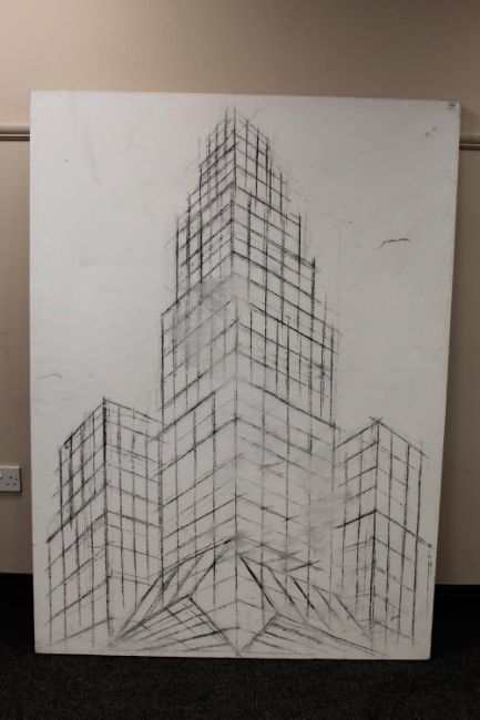 Donald James White : Tower Study in Black and White, oil on canvas, 168 cm 122 cm, on stretcher but unframed.