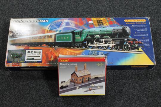 A boxed Hornby Railways Flying Scotsman electric train set and a boxed Hornby country station