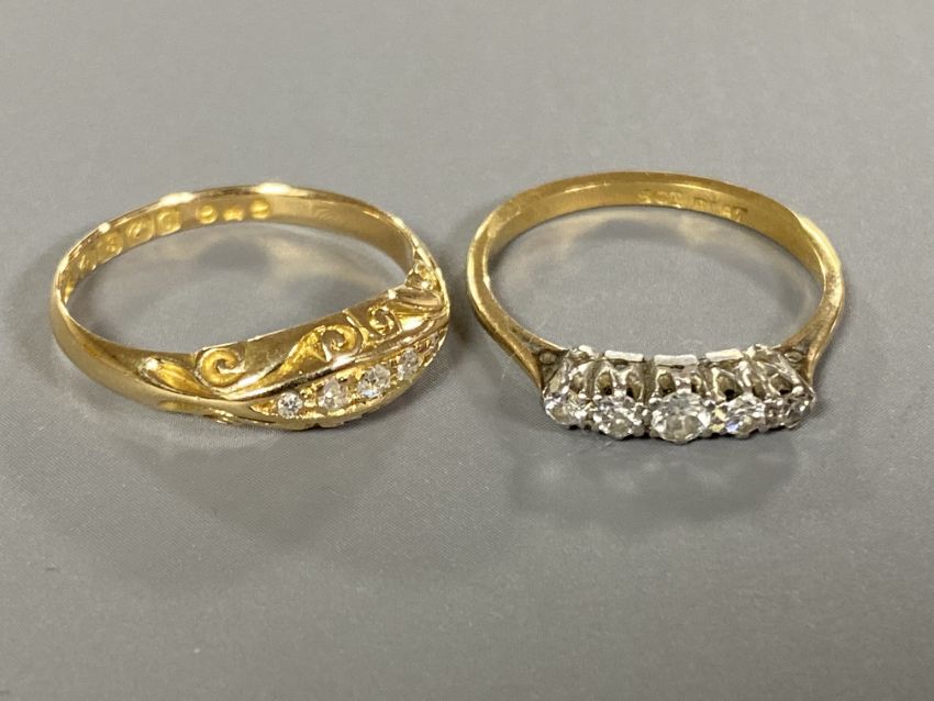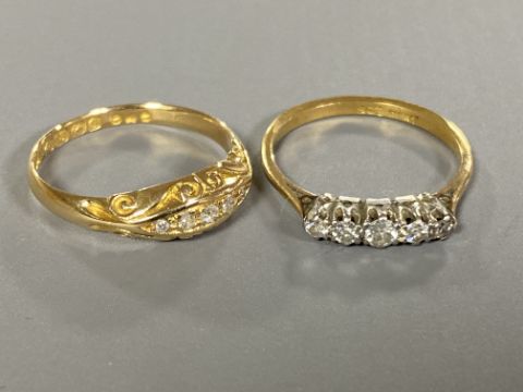 Two 18ct gold five stone diamond rings (2)