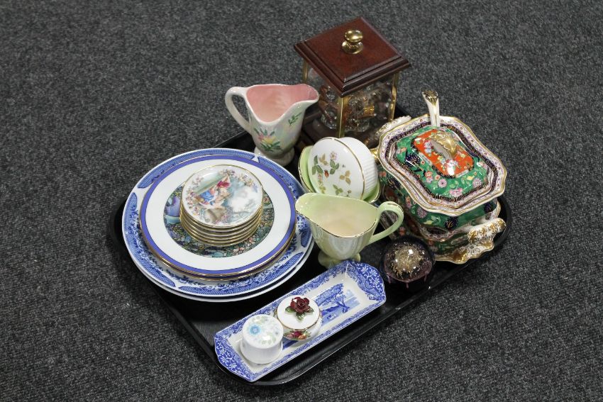 A tray of ornamental glass boat in display case, blue and white plates, tureen and cover, paperweight etc