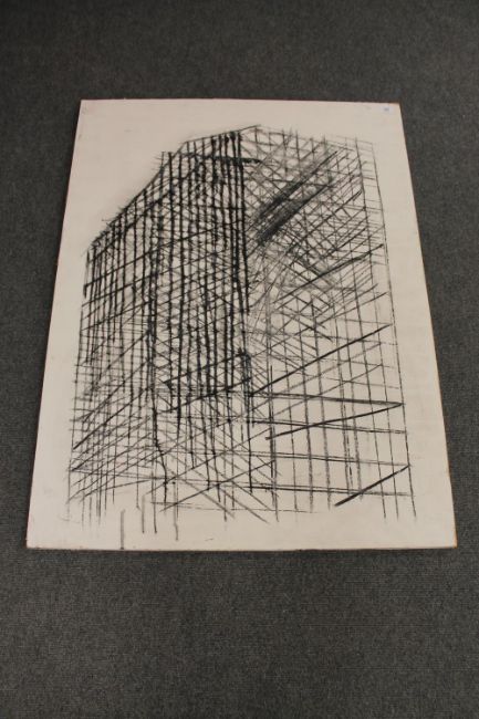Donald James White : Tower Study in Black and White, oil on board, 123 cm x 91 cm, unframed.