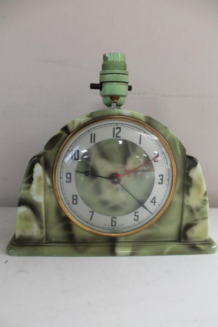 An Art Deco green Bakelite mantel clock fitted with a lamp