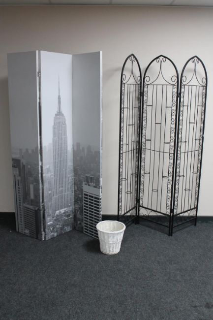 A metal candle stand, canvas screen depicting skyline of New York